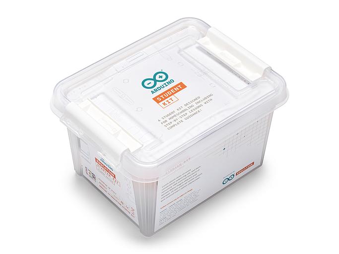 The Arduino Student Kit is divided into nine step-by-step lessons and two open-ended group projects. The kit contains boards, a collection of sensors and actuators, and access to an online platform, with extra content including invention spotlights, concepts, and interesting facts about electronics, technology, and programming.