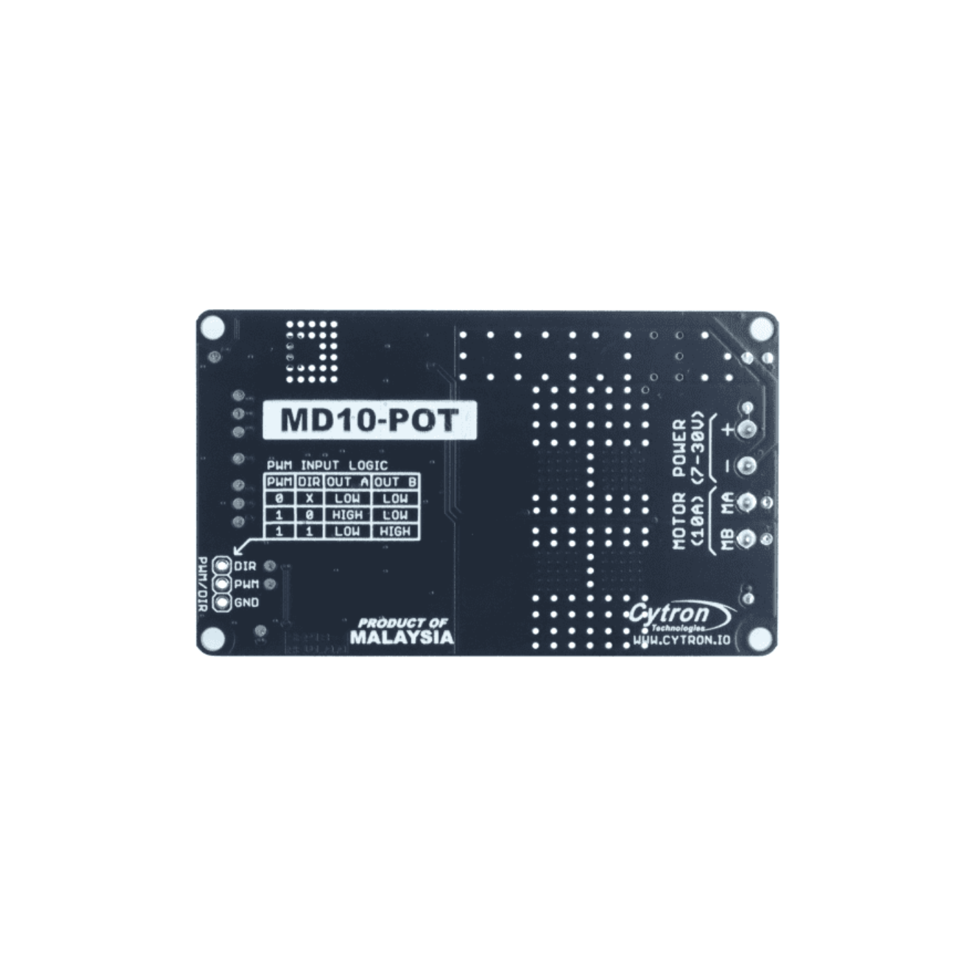 The Cytron MD10-POT 10A DC motor driver is a user-friendly motor speed controller designed for hassle-free operation without any microcontroller or programming.