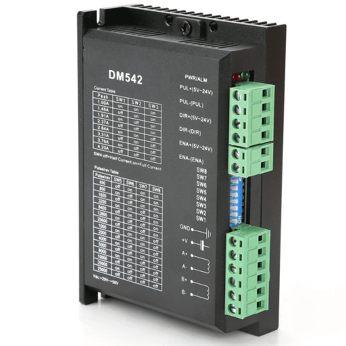 The DM542T is a digital stepper motor driver with an advanced DSP control algorithm, incorporating the latest motion control technology. This driver boasts unparalleled system smoothness, delivering optimal torque and eliminating mid-range instability. Its motor auto-identification and parameter auto-configuration features also facilitate quick and easy setup to optimal modes for different motors. Compared to traditional analogue drives, the DM542T operates with much lower noise and heating and offers smoother movement when driving a stepper motor. Its unique characteristics make it the perfect choice for high-requirement applications. The DM542T is highly recommended as a motor driver for NEMA 17 and NEMA 23 motors.