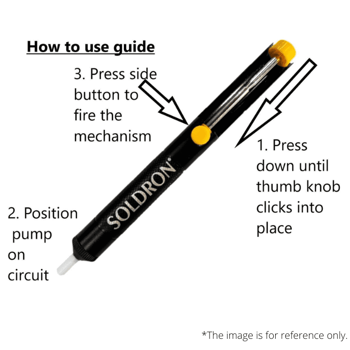 This Soldron High Quality Black Aluminium Body Desoldering Pump is an economical and durable full Aluminium metal body desoldering pump with a heat-resistant replaceable silicone tip. This quality product has exceptional desoldering ability due to strong suction and durable build.