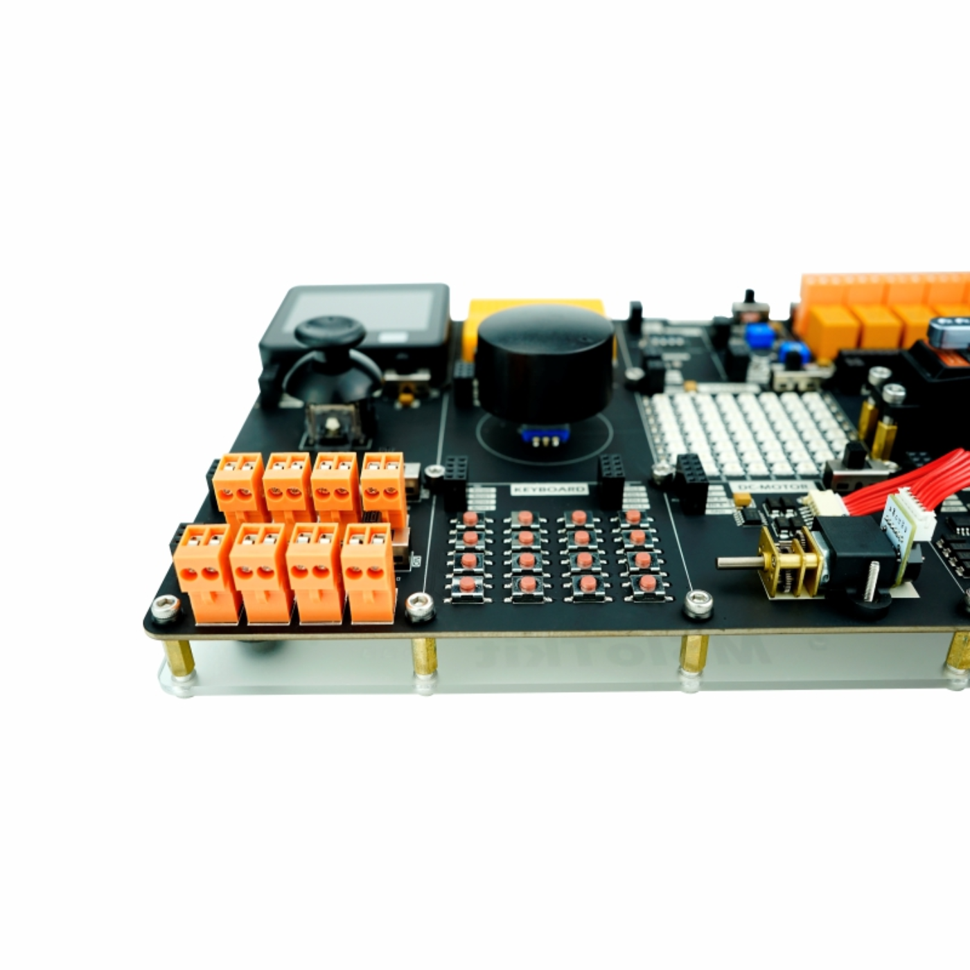• Includes various input-output components such as joystick, rotary encoder, 4×4 button matrix, and ADC/DAC channels.